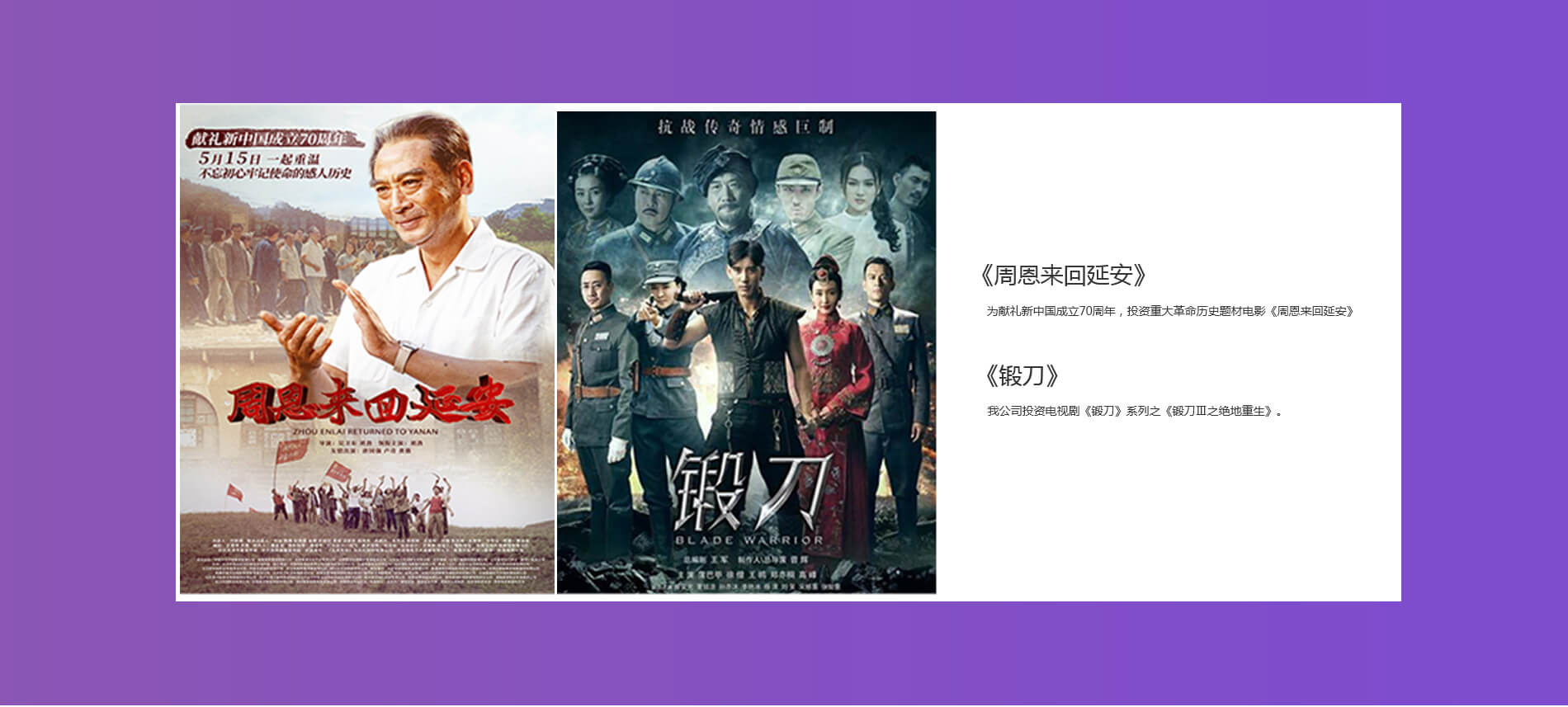 為獻(xiàn)禮新中國(guó)成立70周年,投資重大革命歷史題材電影《周恩來(lái)回延安》。2017年12月15日,電影項(xiàng)目啟動(dòng)儀式暨新聞發(fā)布會(huì)在釣魚臺(tái)國(guó)賓館舉行。電影《周恩來(lái)回延安》從創(chuàng)作之初就受到了中宣部、文化和旅游部、中共中央文獻(xiàn)研究室、國(guó)家廣播電視總局等單位的關(guān)注和指導(dǎo),并得到了周恩來(lái)同志的親屬及他曾經(jīng)的秘書、警衛(wèi)等各界人士的大力支持。該片上映后受到社會(huì)各界的高度評(píng)價(jià),不僅作為教學(xué)課程在中共中央黨校點(diǎn)映,還入選中宣部、教育部等聯(lián)合主辦的“看紅色電影,愛偉大祖國(guó)”優(yōu)秀電影進(jìn)校園系列活動(dòng)播放影片。中宣部《黨建》雜志社更是召開以“弘揚(yáng)周總理崇高精神,不忘初心、牢記使命”為主題的研討會(huì),總結(jié)研討了該片的藝術(shù)成就、思想內(nèi)涵及現(xiàn)實(shí)意義。9月,該片獲得了第十五屆精神文明建設(shè)“五個(gè)一工程”獎(jiǎng)。 《周恩來(lái)回延安》以1973年6月被檢查出患有癌癥的周恩來(lái)總理回到闊別二十六年的延安,延安的十三年往事歷歷在目,這方熱土養(yǎng)育了中國(guó)革命,養(yǎng)育了人民軍隊(duì),形成了中國(guó)共產(chǎn)黨第一代領(lǐng)導(dǎo)集體,鑄就了中國(guó)共產(chǎn)黨的領(lǐng)導(dǎo)地位。演繹一代偉人對(duì)人民的深情牽掛,講述周恩來(lái)總理時(shí)隔26年回到革命圣地延安的短暫22小時(shí),謳歌中國(guó)共產(chǎn)黨與人民血肉相連及不忘初心、不懈奮斗、砥礪前行的偉大精神。 影片上映以來(lái),人民網(wǎng)、新華網(wǎng)、央視網(wǎng)等核心官方媒體紛紛給予肯定評(píng)價(jià),好評(píng)如潮,可見影片影響之轟動(dòng)和廣泛。